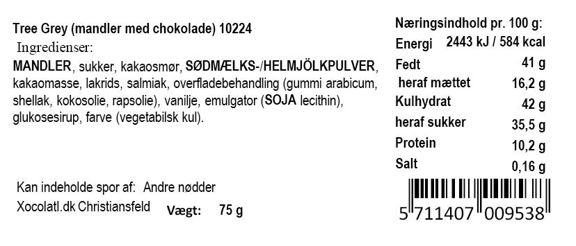 Smuk juletræsæske med et indhold af sprøde ristede mandler med chokolade, lakrids og sprød sukkerskal.