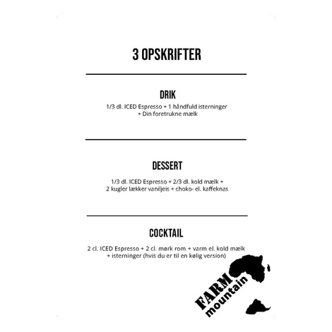 - Blandingsforhold: 1/3 dl Iced Espresso til 1-2 dl mælk, valgfri mængde is
