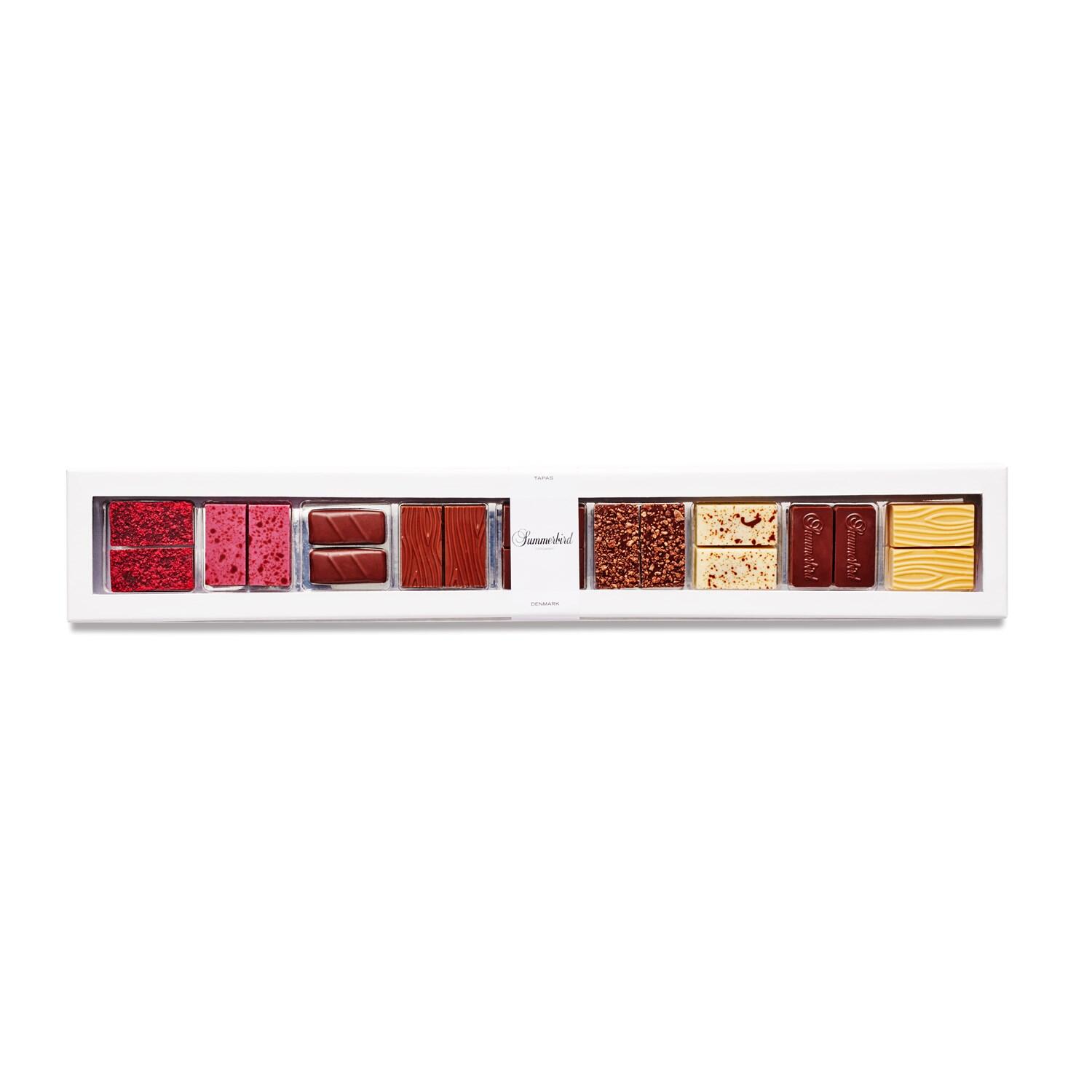 Populærere Tapas-gaveæske indeholder en variation over små elegante stykker fyldte chokolader. Æsken byder på en verden af velsmag i form af f.eks. praliné, hindbær, mint eller passion. Ganske enkelt den perfekte æske til dem, som sætter pris på små dekadente smagsoplevelser og harmoni.